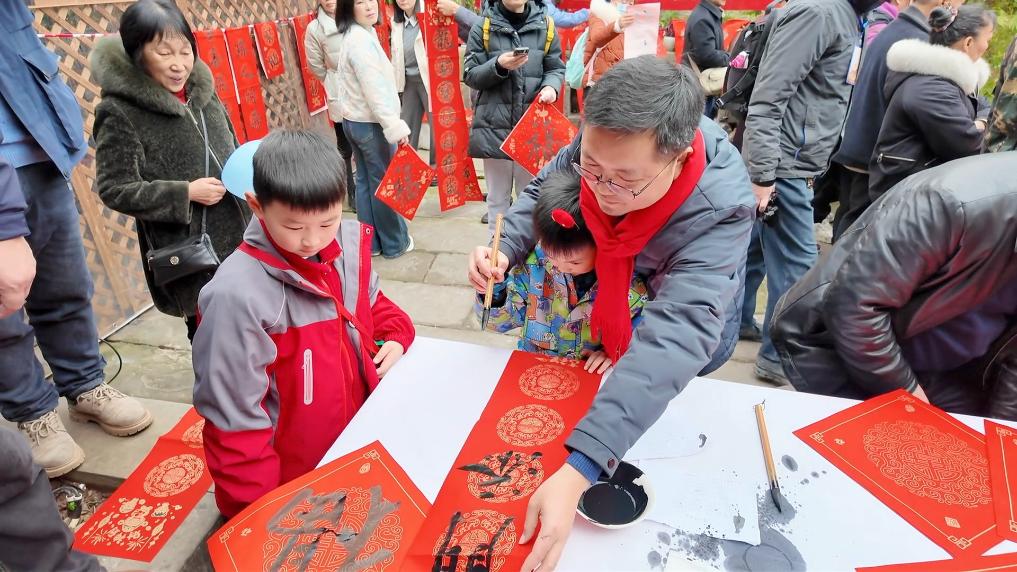 在當(dāng)日的非遺巡游環(huán)節(jié),鯉魚(yú)燈、舞龍舞獅、雜耍、川劇變臉吐火、塘河鎮(zhèn)婚俗嗩吶、狀元巡街、財(cái)神送福等精彩節(jié)目接連上演,吸引眾多游客駐足拍照;在非遺文化體驗(yàn)互動(dòng)區(qū),書(shū)法家們揮毫潑墨,將書(shū)法藝術(shù)、民俗文化融為一體,創(chuàng)作出一幅幅作品,游客們排起長(zhǎng)隊(duì),依次領(lǐng)取“新年祝?!薄?/p>