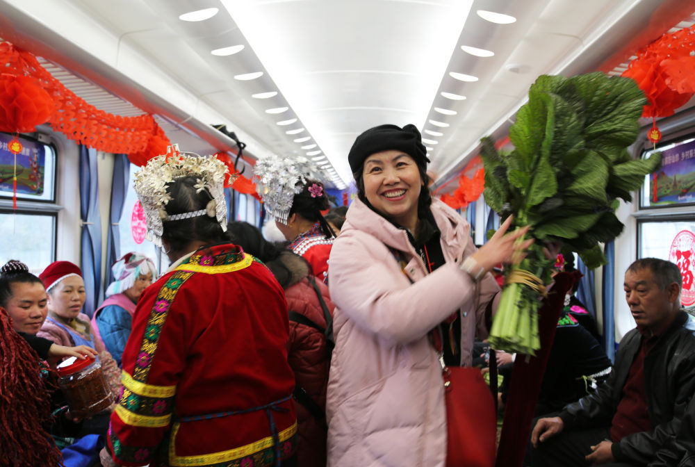 1月18日,沿途村民在5640次列車“鄉(xiāng)村集市”車廂售賣農產品。新華社記者 楊文斌 攝