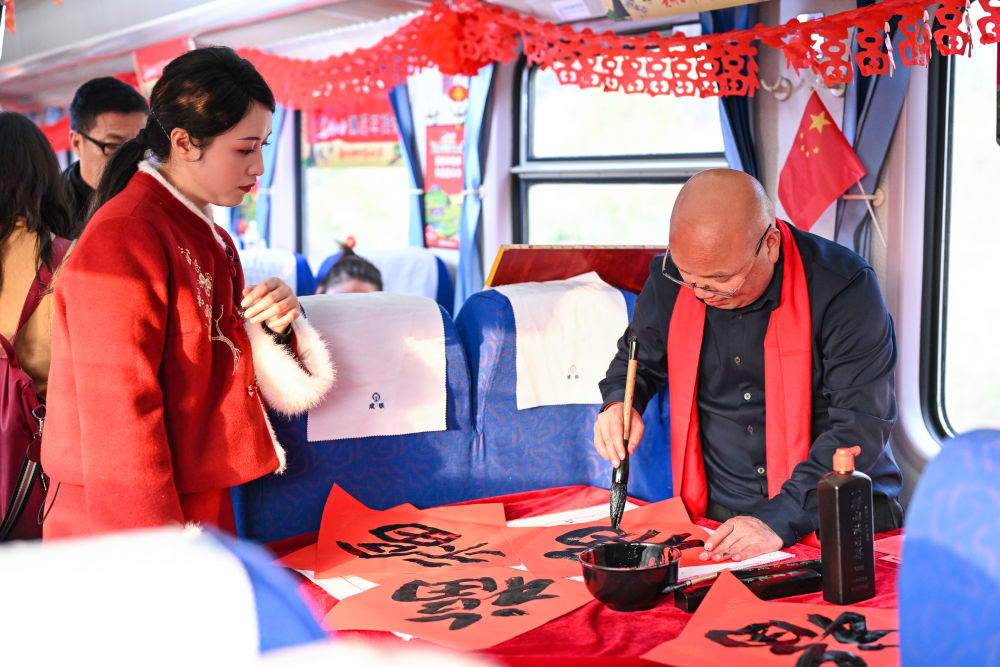 1月18日,非遺傳承人在5640次列車上向乘客展示剪紙技藝。新華社記者 楊文斌 攝