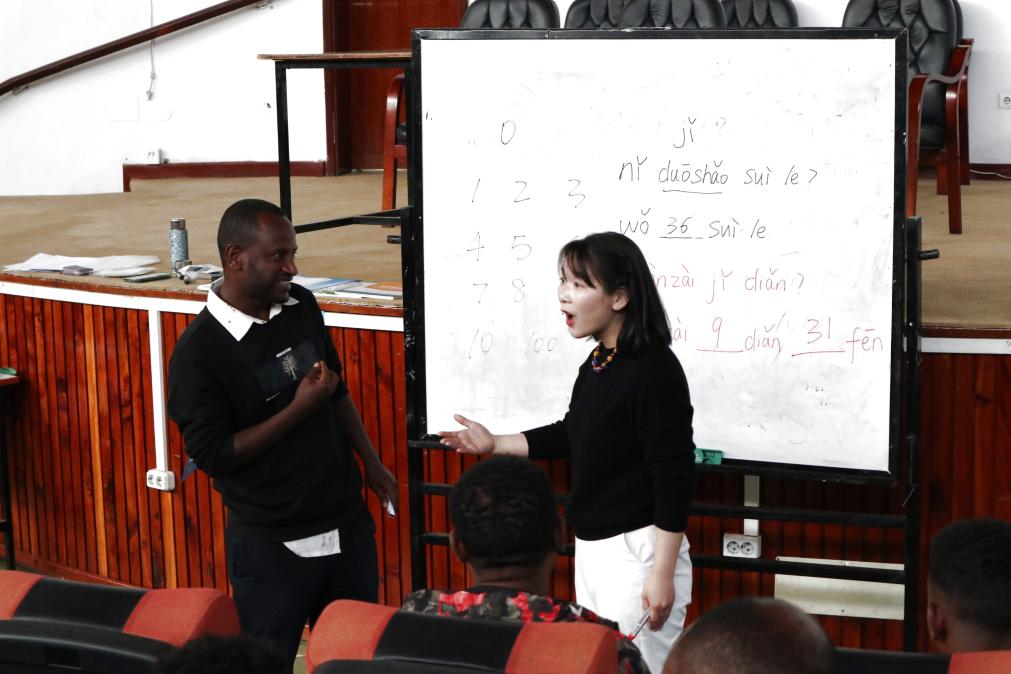 2024年12月2日,在埃塞俄比亞亞的斯亞貝巴大學(xué),孔子學(xué)院老師宋瑞榮(右)在教室與學(xué)生互動。新華社記者 劉方強(qiáng) 攝