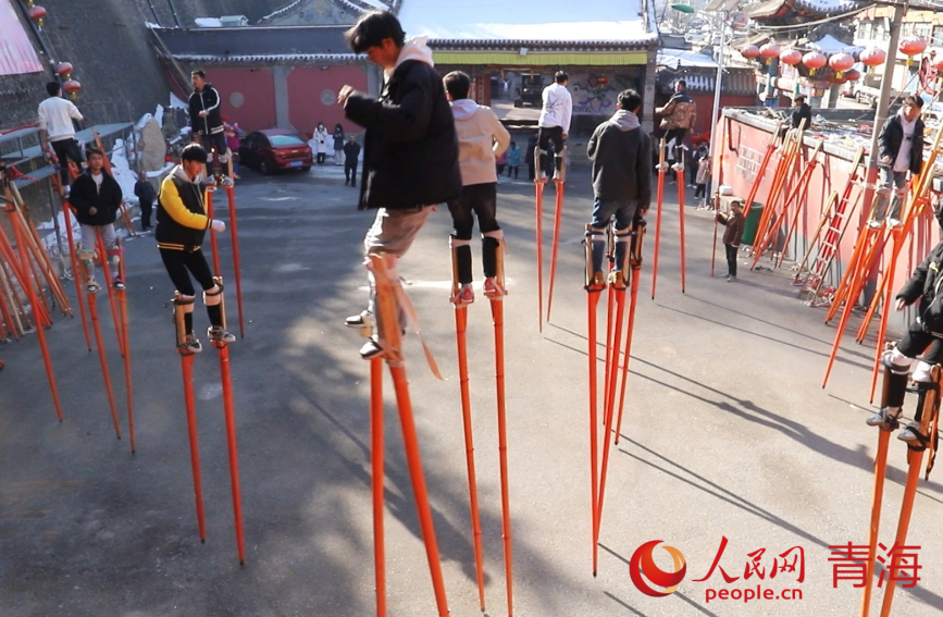 綁蹺、試蹺、定蹺……青海省西寧市湟中區(qū)魯沙爾鎮(zhèn)火神廟,魯沙爾高蹺隊(duì)迎來了春節(jié)前最后一次排練?!皬呐D月初一到現(xiàn)在二十多天了,今年大家積極性很高,報(bào)名的人也多,排練效果不錯(cuò)?!弊龊脺?zhǔn)備,隨著社火音樂的鼓點(diǎn)舞動(dòng)起來,魯沙爾鎮(zhèn)高蹺協(xié)會(huì)會(huì)長(zhǎng)李玉龍站在臺(tái)階上看著排練隊(duì)形。