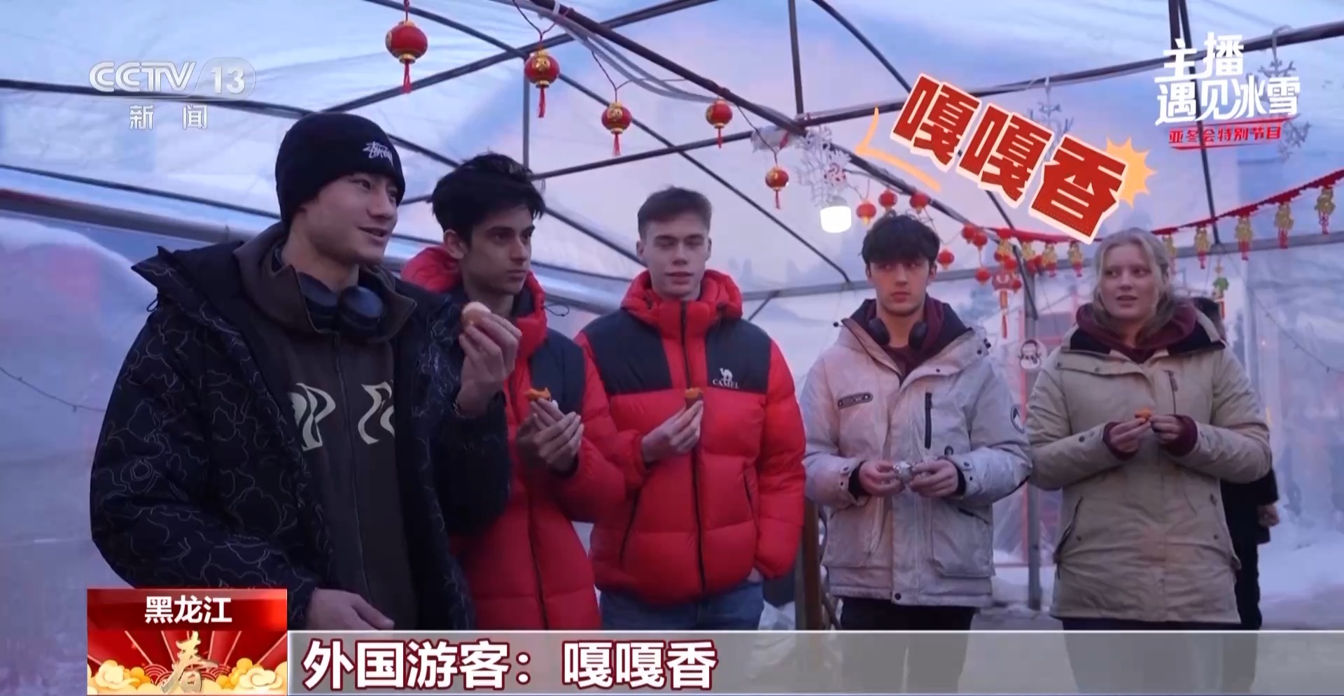 聊著聊著,北星村來了一個外國旅行團(tuán),他們吃著紅薯擼著串,村民還熱情地端上了東北餃子。大家吃得怎么樣?外國游客用中文表示:嘎嘎香!