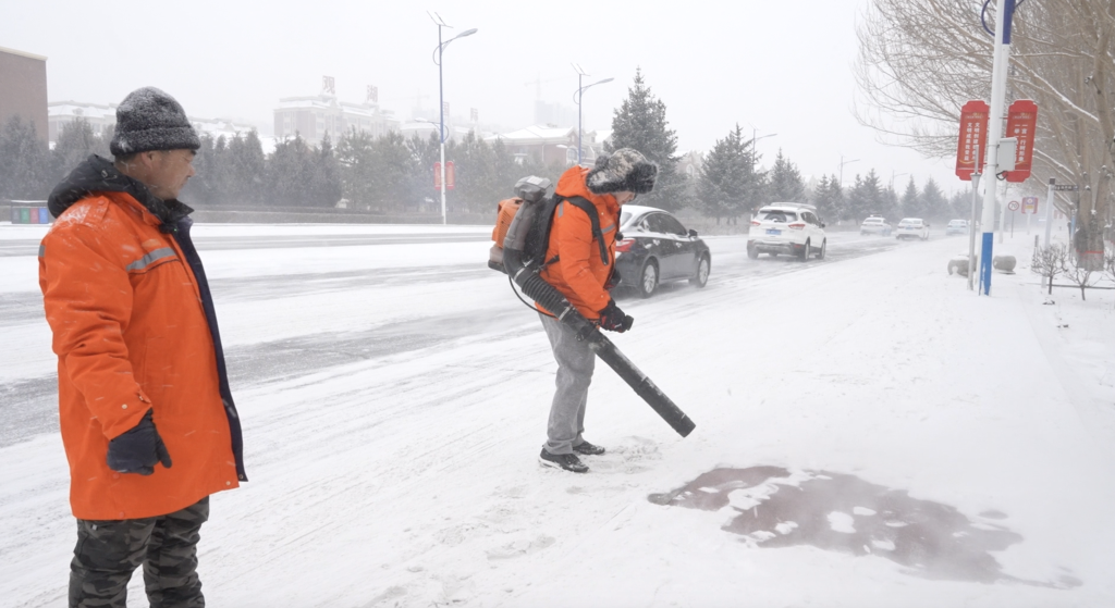 背上清掃機(jī),扣動開關(guān),左右搖擺風(fēng)槍,看著成片的浮雪被吹散,記者似乎找到了“童趣”,然而很快便體會到了這項工作的不易:十多公斤對記者來說不算重,但它并不像書包那般柔軟,堅硬的汽油機(jī)轟鳴震動,沒有緩沖地拍打著脊背。短短十多分鐘,起初的新鮮感和樂趣便已消失,只有噪音為伴。