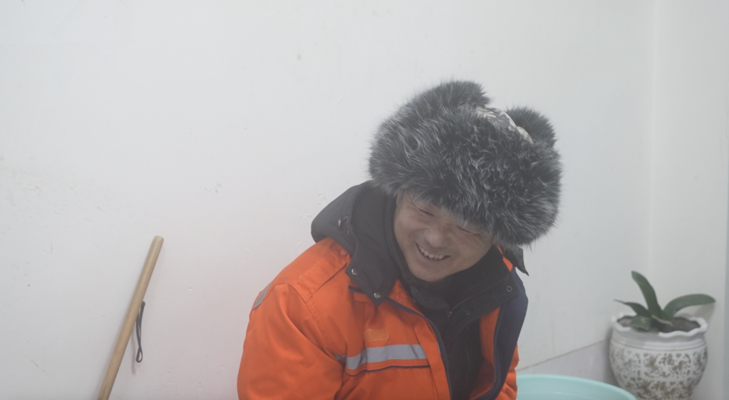 從下午1點半到4點,記者和工友們一刻未停。風(fēng)雪中,大伙都變成了“白眉大俠”,睫毛上也結(jié)了冰。王師傅提出,去附近的環(huán)衛(wèi)驛站里歇歇腳,喝些熱茶。