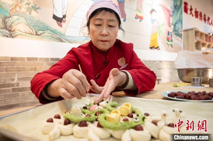 1月10日,面塑手藝人續(xù)愛花制作“蛇盤兔棗山面塑”。 中新社記者 韋亮 攝