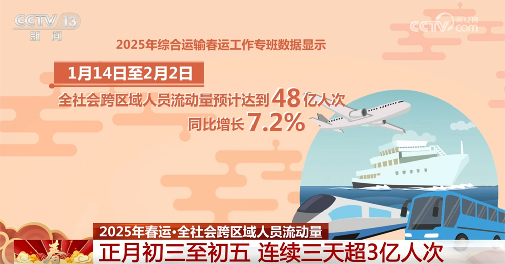 來自2025年綜合運(yùn)輸春運(yùn)工作專班數(shù)據(jù)顯示:1月14日至2月2日,全社會(huì)跨區(qū)域人員流動(dòng)量預(yù)計(jì)達(dá)到48億人次,同比增長(zhǎng)7.2%;正月初三、初四、初五已連續(xù)三天超3億人次,均超去年同期水平。
