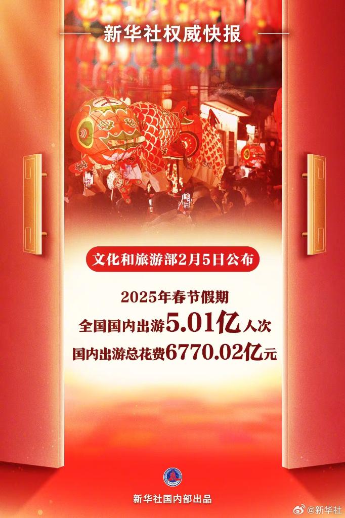 2月5日,文化和旅游部公布春節(jié)假期最新數(shù)據(jù):春節(jié)假期8天,全國國內(nèi)出游5.01億人次,同比增長5.9%;國內(nèi)出游總花費(fèi)6770.02億元,同比增長7.0%。全國出游人次和總花費(fèi)再創(chuàng)新高!