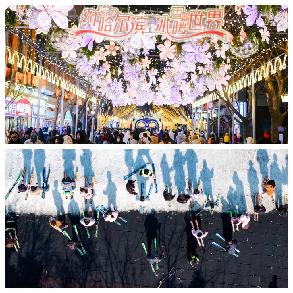 拼圖:(上圖)1月30日,游客在哈爾濱中央大街上游玩、拍照。(下圖)2月3日,游客在江蘇省淮安市馬頭鎮(zhèn)的古運(yùn)河滑雪場滑雪(無人機(jī)照片)。