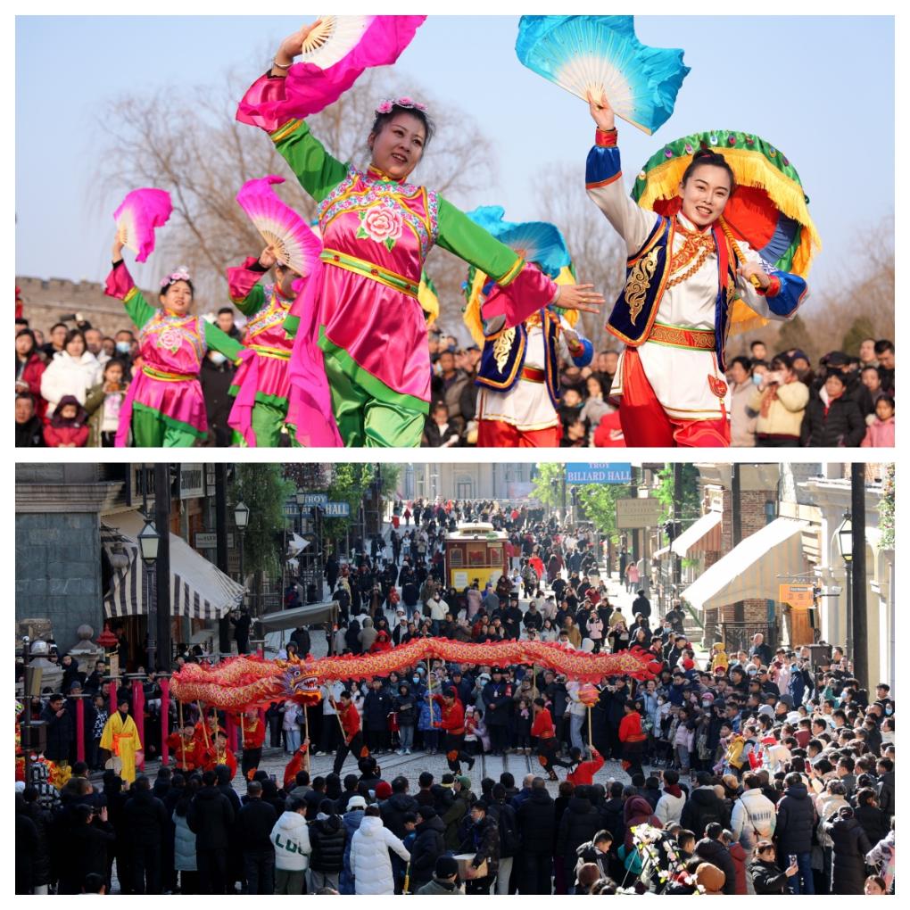 拼圖:(上圖)2月2日,在河北省石家莊市井陘縣天長宋古城,民俗藝人為游客表演井陘拉花。(下圖)2月3日,游客在山東省樂陵市影視城觀看舞龍表演。