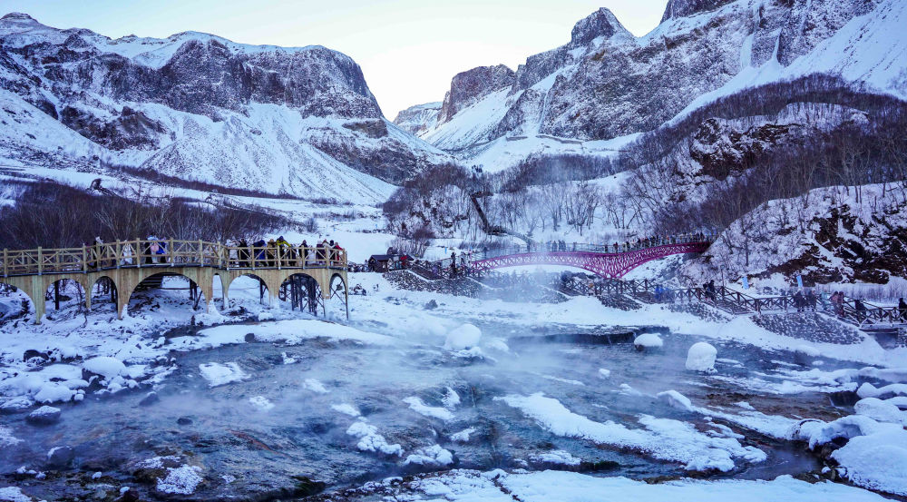長(zhǎng)白山天池以北的延邊州,溫泉室外的樹(shù)枝上覆滿積雪,泡池內(nèi)滾燙的地?zé)嵩丛床粩?。伸出腳尖觸水,一股暖意傳遍全身。延邊云集安圖火山泉、龍井氟溫泉、延吉低氘溫泉等多種特色溫泉,吸引海內(nèi)外眾多游客慕名而來(lái)。