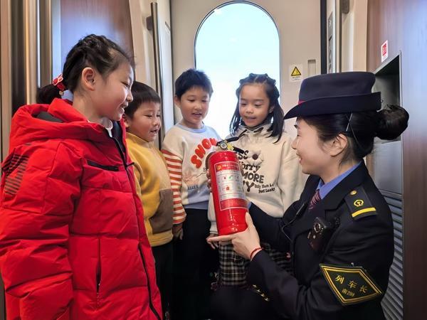 春運(yùn)期間,南昌客運(yùn)段組織開展安全乘車小課堂。圖為G1584次列車乘務(wù)員在給小朋友講解列車消防設(shè)備設(shè)施的使用。王夢(mèng)婧子/攝