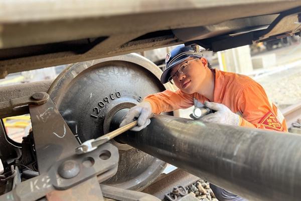 2月1日,中國(guó)鐵路南昌局集團(tuán)有限公司福州東車輛段廈門北運(yùn)用車間東孚作業(yè)場(chǎng),檢車員邱龍?jiān)跈z查中歐班列。向帥/攝