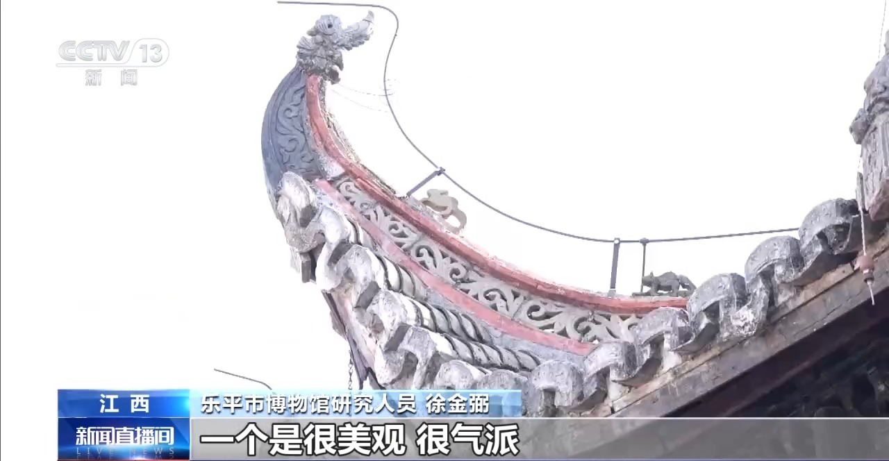 樂(lè)平市博物館研究人員 徐金弼:寶頂在古建筑里面一般都有,一個(gè)是很美觀、很氣派。它可以避雷,起保護(hù)古建筑作用。戲臺(tái)翹角,它有兩個(gè)功能,一個(gè)防水,一個(gè)采光,氣勢(shì)恢宏。