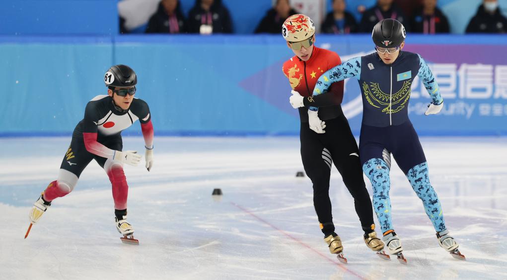 2月7日,中國選手林孝埈(中)與哈薩克斯坦選手阿迪勒·加利亞赫梅托夫(右)在比賽中沖線。當(dāng)日,第九屆亞冬會短道速滑男子1500米四分之一決賽在哈爾濱舉行。新華社記者 許雅楠 攝