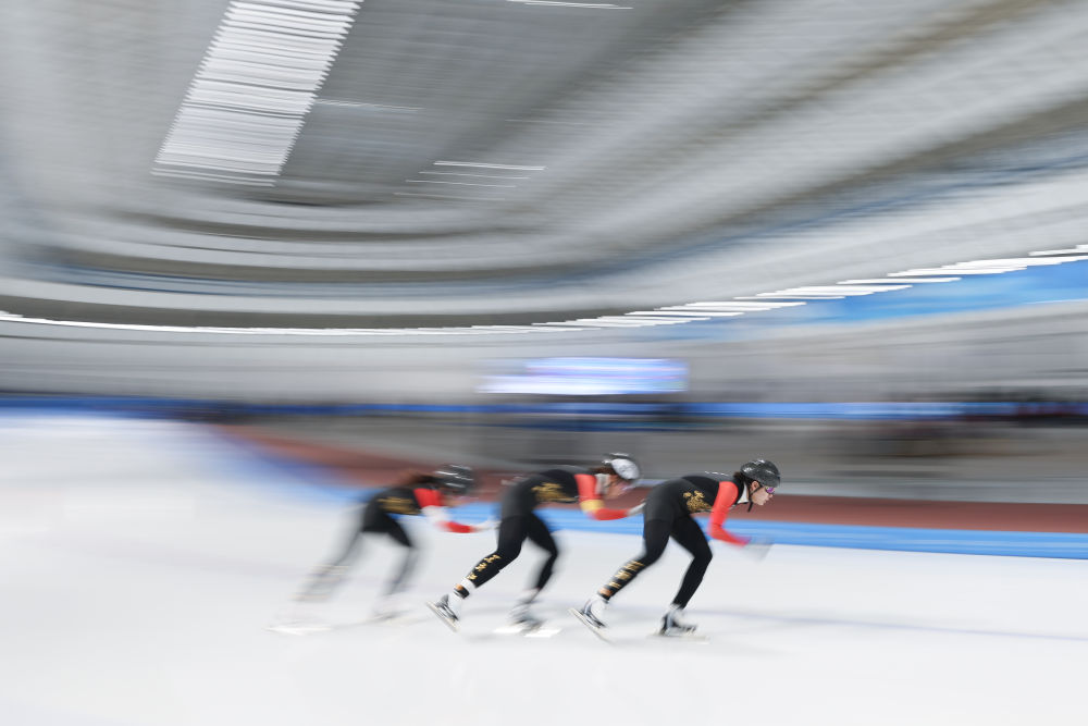 2024年12月15日,黑龍江省冰上訓(xùn)練中心二隊(duì)選手在比賽中。當(dāng)日,2024-2025賽季中國杯速度滑冰精英聯(lián)賽第四站暨亞冬會(huì)測試賽女子團(tuán)體追逐比賽在黑龍江省冰上訓(xùn)練中心舉行。