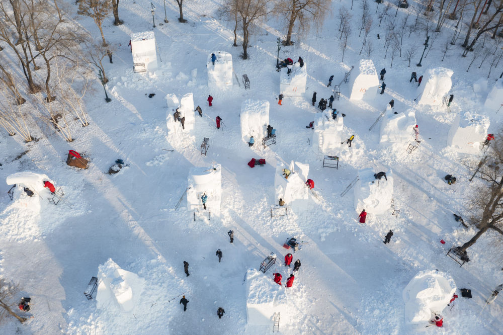 2025年1月6日,第27屆哈爾濱國際雪雕比賽參賽選手在雕刻雪雕作品。來自10個(gè)國家20余支代表隊(duì)的雪雕藝術(shù)家在哈爾濱太陽島雪博會(huì)園區(qū)同場競技。