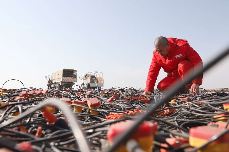 在施工現(xiàn)場,需要檢測的無線節(jié)點(diǎn)儀器和檢波器串?dāng)[成了一個(gè)巨大的圓形圖案,李國忠和物探隊(duì)員一起為這些儀器做“健康體檢”。李國忠介紹,無線節(jié)點(diǎn)儀器穩(wěn)定性高、便于攜帶,主要用在高難山體區(qū)。在沙漠區(qū)采用高精度可控震源,既保證了施工質(zhì)量、提高了施工效率,也保護(hù)了生態(tài)環(huán)境,實(shí)現(xiàn)了綠色勘探。
