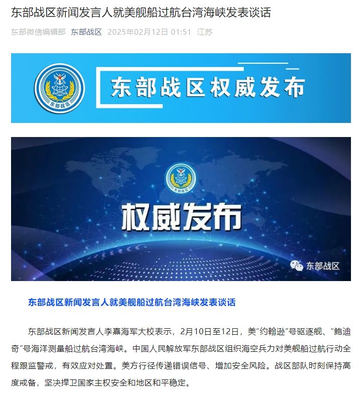 東部戰(zhàn)區(qū)新聞發(fā)言人李熹海軍大校表示,2月10日至12日,美“約翰遜”號(hào)驅(qū)逐艦、“鮑迪奇”號(hào)海洋測(cè)量船過(guò)航臺(tái)灣海峽。中國(guó)人民解放軍東部戰(zhàn)區(qū)組織??毡?duì)美艦船過(guò)航行動(dòng)全程跟監(jiān)警戒,有效應(yīng)對(duì)處置。美方行徑傳遞錯(cuò)誤信號(hào)、增加安全風(fēng)險(xiǎn)。戰(zhàn)區(qū)部隊(duì)時(shí)刻保持高度戒備,堅(jiān)決捍衛(wèi)國(guó)家主權(quán)安全和地區(qū)和平穩(wěn)定。