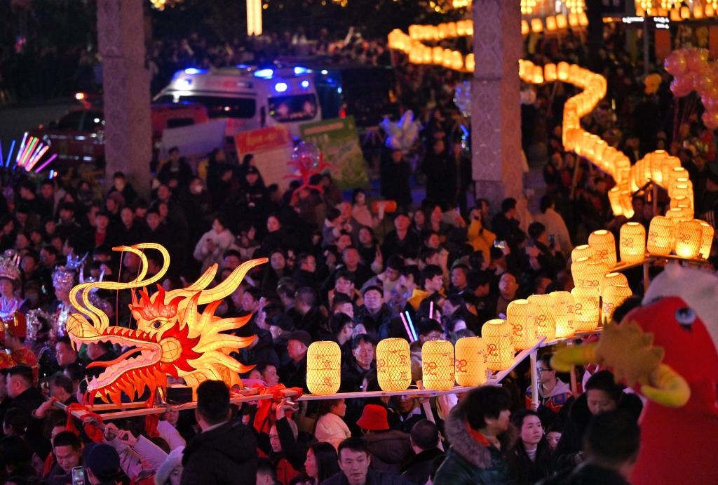 2月10日晚,在湖北省宣恩縣城興隆老街,百米板凳龍在人群中游行。新華社發(fā)(宋文攝)
