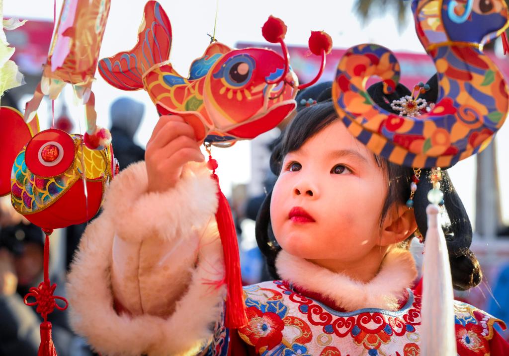 2月9日,一名小朋友在浙江省寧波市寧海縣強蛟鎮(zhèn)峽山村迎元宵節(jié)活動中專注賞燈。新華社發(fā)(胡學軍攝)