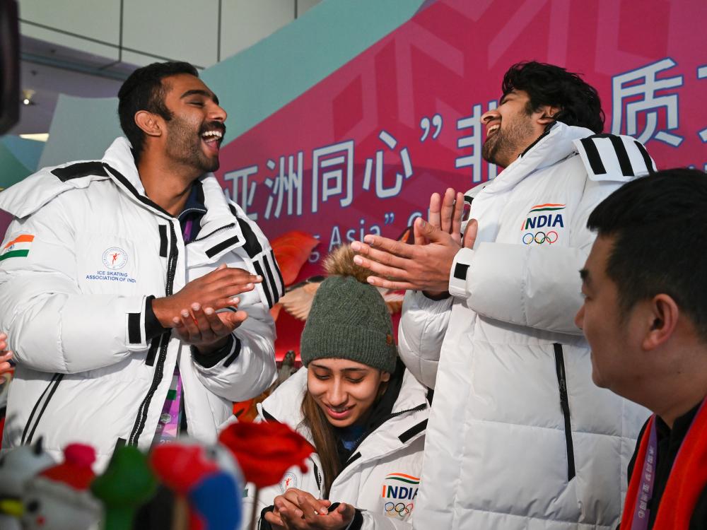 ↑印度代表團(tuán)速度滑冰運(yùn)動員在體驗面塑制作。新華社記者 王曦 攝