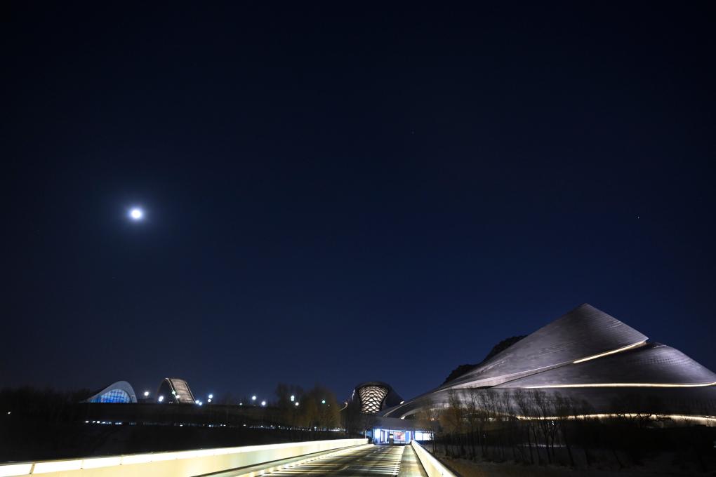 ↑在哈爾濱冰雪大世界拍攝的圓月和亞冬會主火炬。新華社記者 黃偉 攝