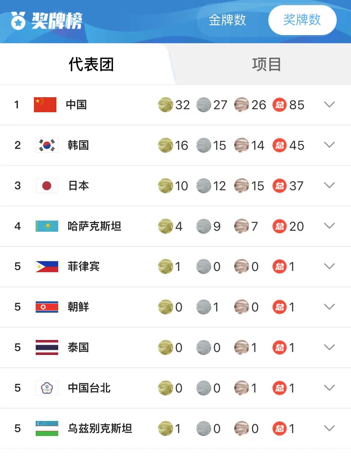 中國體育代表團收獲32金、27銀、26銅共計85枚獎牌,位列本屆亞冬會金牌榜和獎牌榜首位,創(chuàng)造亞冬會歷史參賽最好成績。