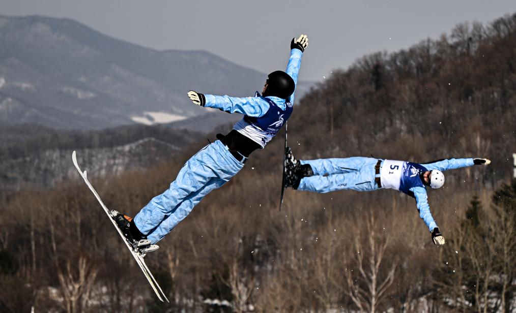 2月11日,哈薩克斯坦選手羅曼·伊萬諾夫/謝爾佐德·卡希爾巴耶夫(左)在比賽中。新華社記者 夏一方 攝