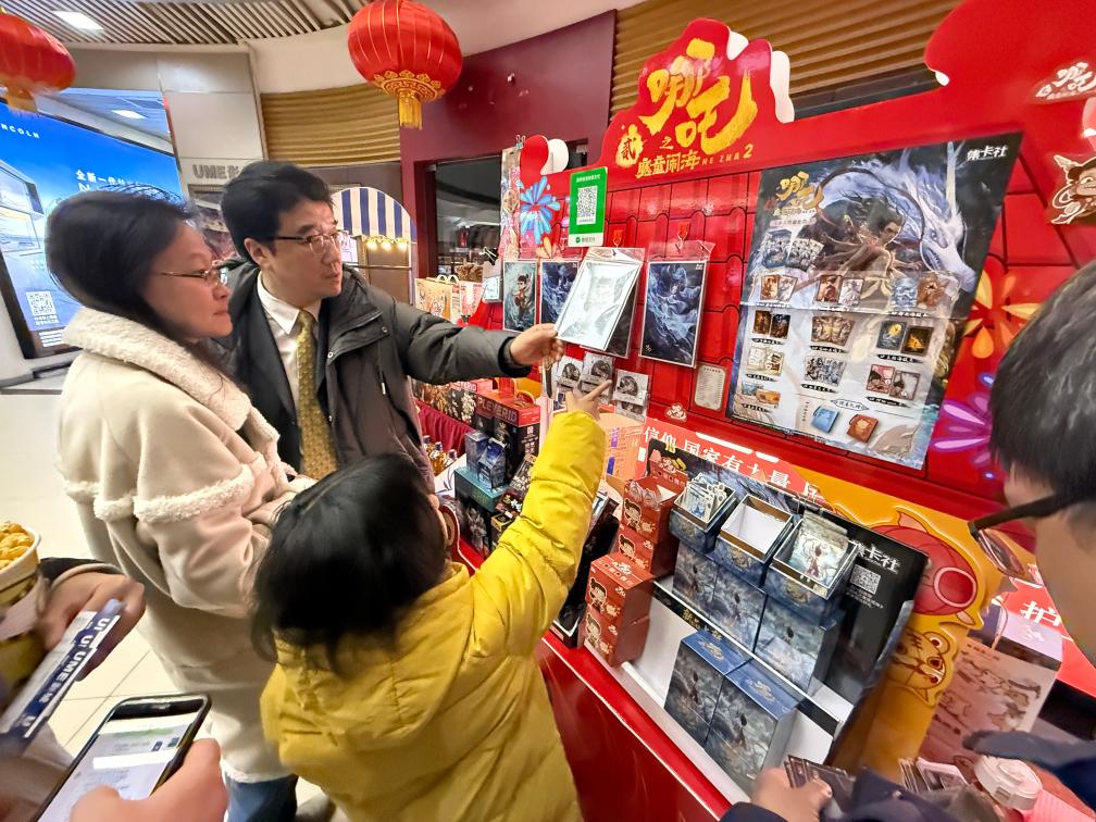 2月14日晚,在北京市海淀區(qū)的UME國(guó)際影城(華星店),家長(zhǎng)帶著孩子挑選電影紀(jì)念品。新華社記者 才揚(yáng) 攝