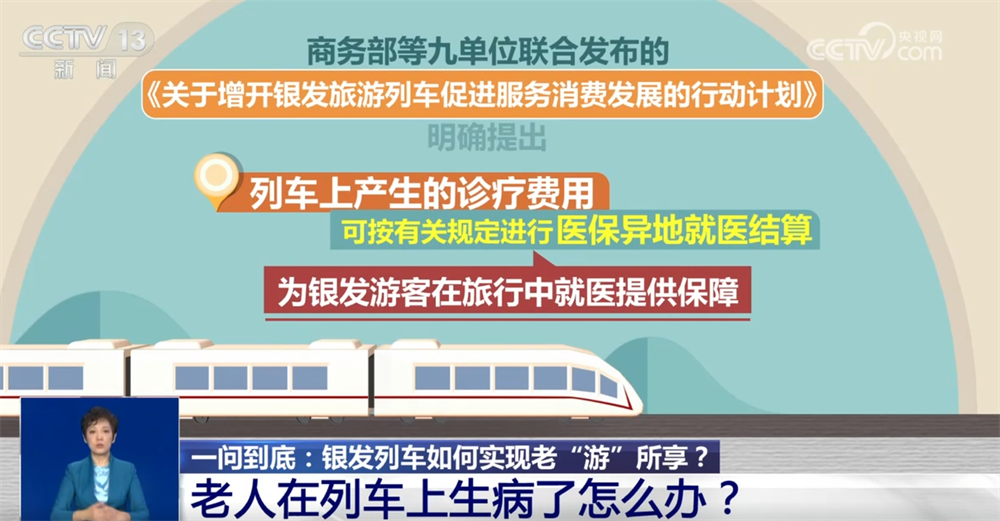 日前,商務(wù)部等九單位聯(lián)合發(fā)布的增開(kāi)銀發(fā)旅游列車(chē)的行動(dòng)計(jì)劃明確提出,列車(chē)上產(chǎn)生的診療費(fèi)用可按有關(guān)規(guī)定進(jìn)行醫(yī)保異地就醫(yī)結(jié)算,為銀發(fā)游客在旅行中就醫(yī)提供了保障。