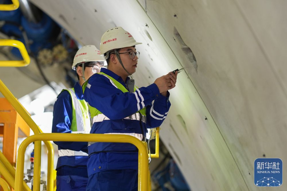 2月25日,中鐵十四局技術(shù)人員在甬舟鐵路金塘海底隧道“甬舟號(hào)”盾構(gòu)機(jī)內(nèi)測(cè)量管片拼裝作業(yè)情況。