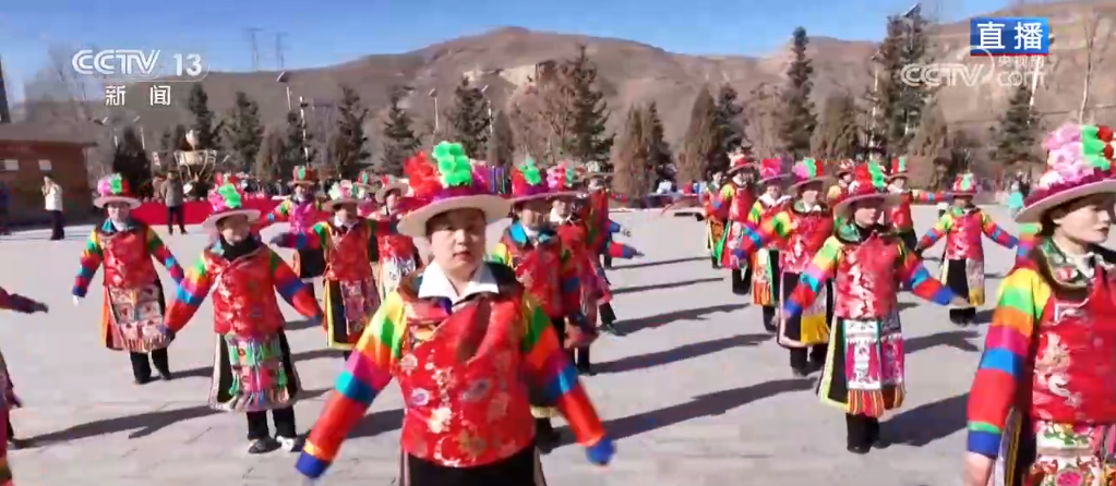記者來到班彥村的村口廣場看到,三十多位土族姑娘和小伙子們身穿鮮艷的民族服飾,手挽手肩并肩,跳起土族傳統(tǒng)舞蹈——安召舞,為即將到來的互助縣農(nóng)歷“二月二”傳統(tǒng)擂臺廟會暨“非遺宣傳周”展示活動(dòng)做準(zhǔn)備。歡快的節(jié)奏真的是非常有感染力,每個(gè)人身上似乎都洋溢著火一般的熱情。
