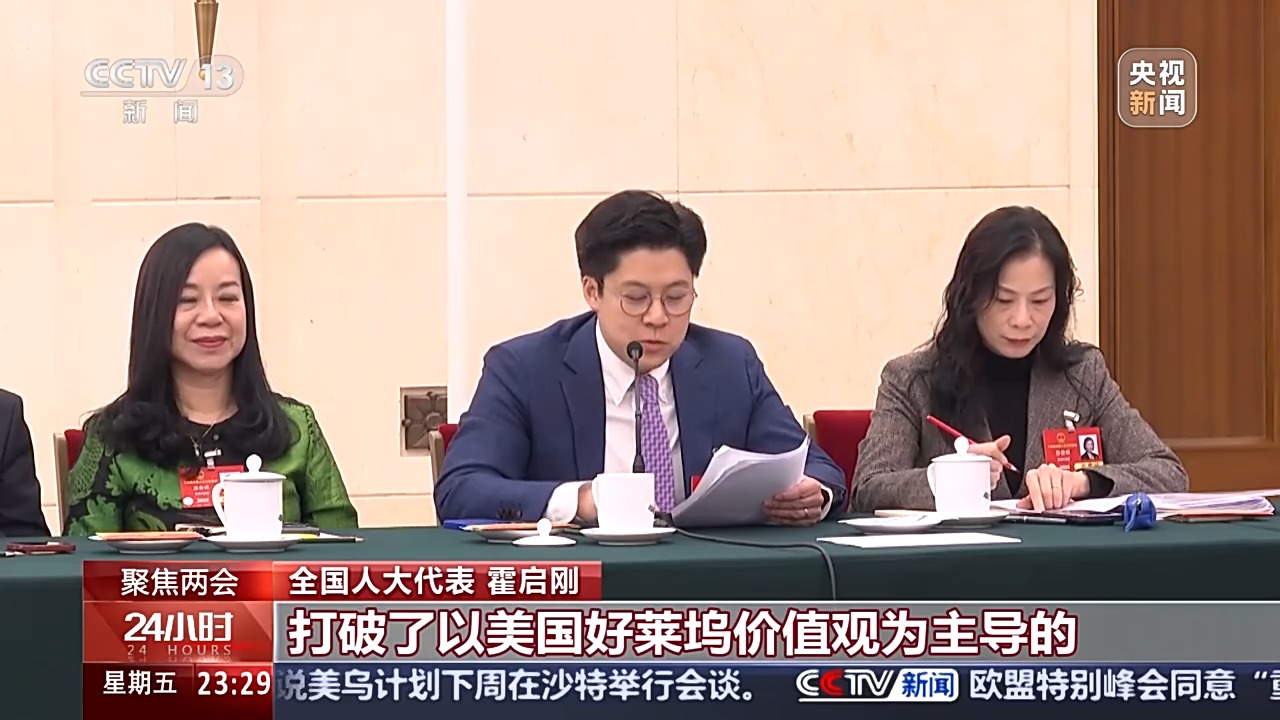 全國人大代表 霍啟剛:最近的《哪吒2》更創(chuàng)下票房歷史,打破了以美國好萊塢價(jià)值觀為主導(dǎo)的這種說故事的方式,成功以我們中國的故事和中國的哲學(xué)感染世界的觀眾。我認(rèn)為香港可以更加用文化+的概念跟理念,在文化產(chǎn)業(yè)發(fā)展上作出更多的貢獻(xiàn),更以香港國際橋梁和傳統(tǒng)優(yōu)勢(shì),實(shí)現(xiàn)中國文化抱團(tuán)出海等,讓文化事業(yè)和文化產(chǎn)業(yè)得以相輔相成,把香港發(fā)揮成中華文化產(chǎn)業(yè)中的“金融港”和“出口港”。