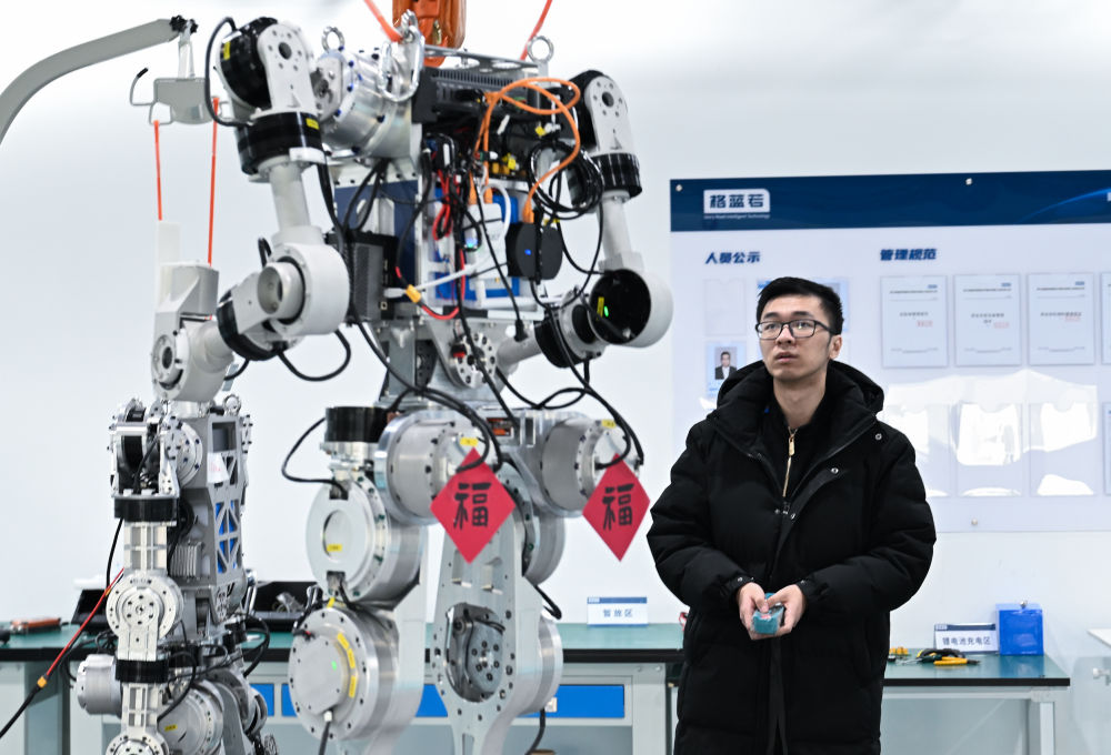 2月24日,湖北武漢格藍(lán)若智能技術(shù)股份有限公司員工在調(diào)試人形機器人。新華社記者杜子璇 攝