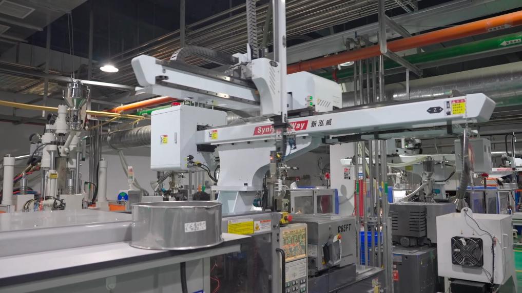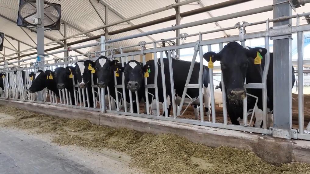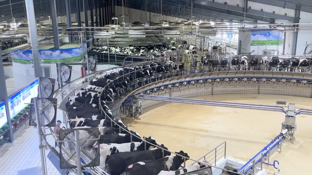 在蜂蜜香氣的吸引下,一頭頭奶牛走向無(wú)人擠奶機(jī),機(jī)械臂靈敏地進(jìn)行消毒、套杯、擠奶,新鮮牛奶便源源不斷生產(chǎn)出來(lái)。
