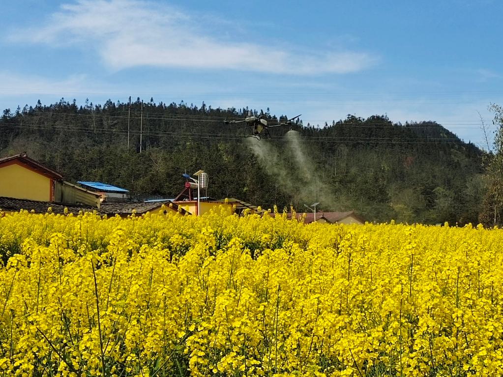 植保無人機(jī)在云南省馬關(guān)縣夾寒箐鎮(zhèn)上布高村的油菜種植基地進(jìn)行飛防作業(yè)。(受訪單位供圖)