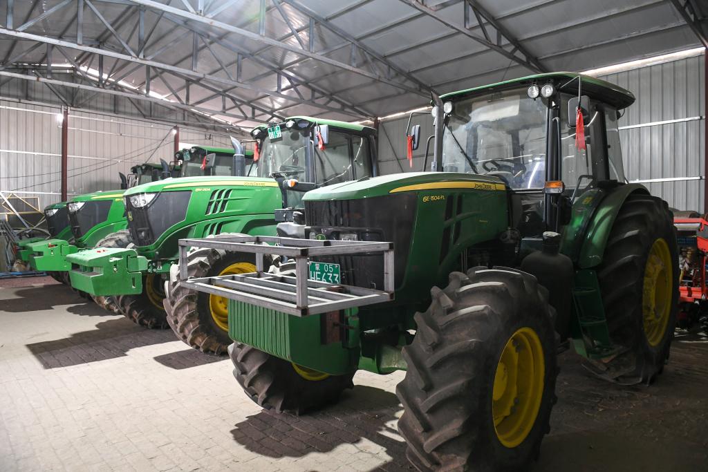 兩臺嶄新的拖拉機(jī)僅車轱轆就一人多高。陳胡日查說,這種拖拉機(jī)省油、效率高,一天能種300多畝地。