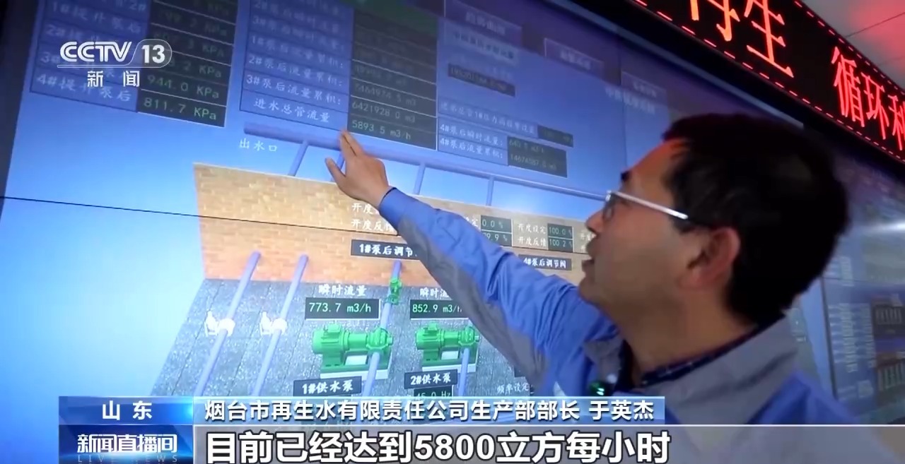 煙臺市再生水有限責任公司生產部部長 于英杰:萬華工業(yè)園區(qū)供水的實時流量顯示,目前已經(jīng)達到5800立方/小時,全天累計14.5萬立方。