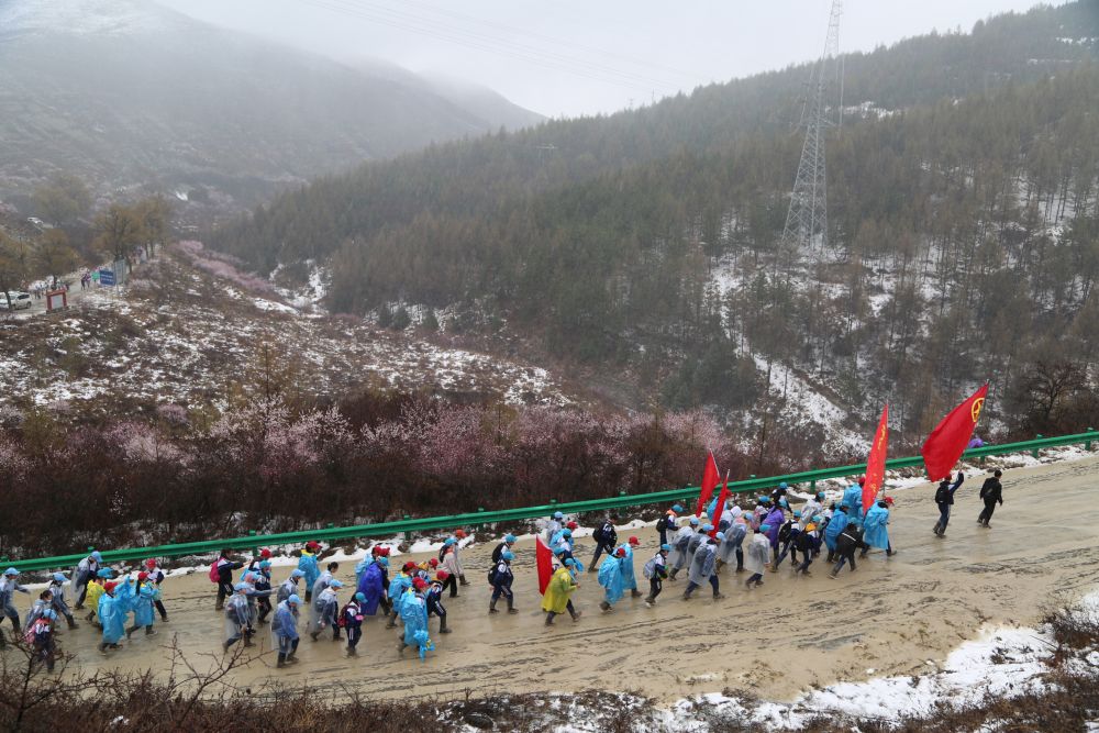 2021年,固原二中和弘文中學(xué)師生經(jīng)歷了迄今為止最艱難的一次徒步:一路上雨雪交加,很多學(xué)生的鞋子被雨水泡濕,不時(shí)陷入泥潭,相互協(xié)助才能拔出;有些路段處處泥水坑,只能一步一步趟水前行,鞋子不時(shí)“呲呲”發(fā)聲;回程時(shí)由于下山道路實(shí)在泥濘難行,不得不臨時(shí)改變線路,沿著山頂返回,拉長路途……