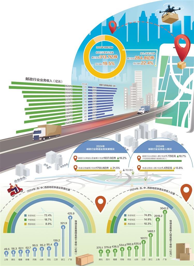 消費是經(jīng)濟增長的主引擎,快遞業(yè)務(wù)增長源于消費需求有效釋放。從中央經(jīng)濟工作會議強調(diào)大力提振消費、提高投資效益,全方位擴大國內(nèi)需求,到今年《政府工作報告》圍繞“大力提振消費”作出工作部署,再到各級政府和有關(guān)部門加碼促消費,消費市場活力持續(xù)攀升。2025年,消費潛能將加速釋放,快遞業(yè)仍將保持穩(wěn)步上升態(tài)勢,更多人會享受到便捷的寄遞服務(wù)。 (本文來源:經(jīng)濟日報 作者:吉蕾蕾)