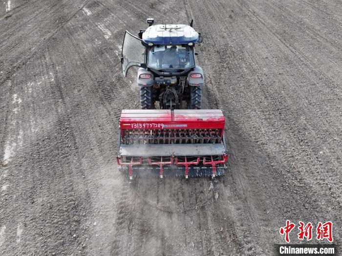 新疆巴音郭楞蒙古自治州庫爾勒市,搭載北斗導航系統(tǒng)的播種機在田間有序作業(yè)。確·胡熱 攝