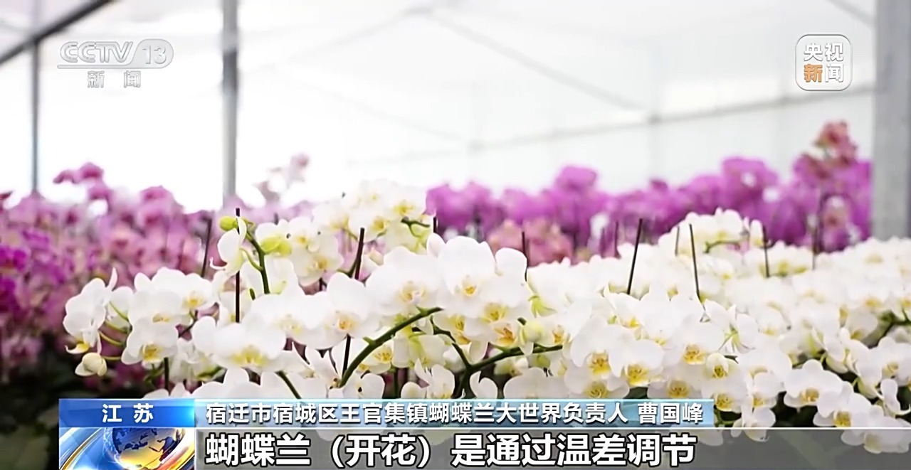 宿遷市宿城區(qū)王官集鎮(zhèn)蝴蝶蘭大世界負(fù)責(zé)人 曹國(guó)峰:其實(shí)蝴蝶蘭的自然花期應(yīng)該是農(nóng)歷年開始一直到“五一”,這是自然狀態(tài)?,F(xiàn)在我們通過(guò)技術(shù)干預(yù),想哪一天開就哪一天開。蝴蝶蘭開花是通過(guò)溫差調(diào)節(jié),這個(gè)時(shí)候我們就要用空調(diào),一些恒溫設(shè)備以及除濕設(shè)備進(jìn)行恒溫控制。