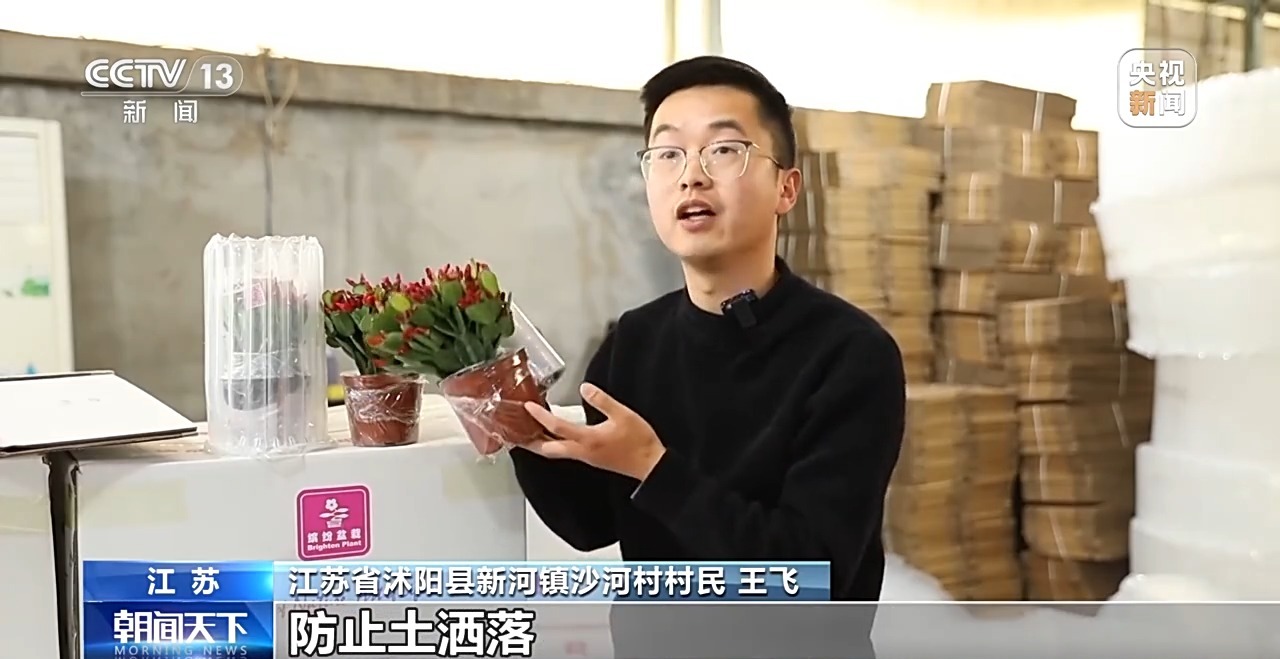 江蘇省沭陽(yáng)縣新河鎮(zhèn)沙河村村民 王飛:我們先用保鮮膜鎖住盆里面的水分,防止土灑落,這樣的包裝可以讓花到買家手里時(shí)更新鮮一點(diǎn)。然后會(huì)用到防摔的氣柱,能保護(hù)花朵。