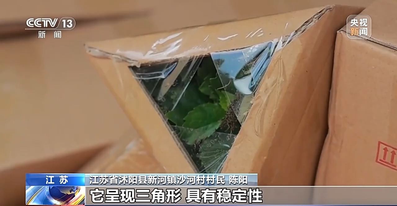 江蘇省沭陽(yáng)縣新河鎮(zhèn)沙河村村民 陳陽(yáng):三角板是環(huán)保透氣性的材料,包裝完之后,它呈現(xiàn)三角形狀,具有穩(wěn)定性,植物不會(huì)受損傷。