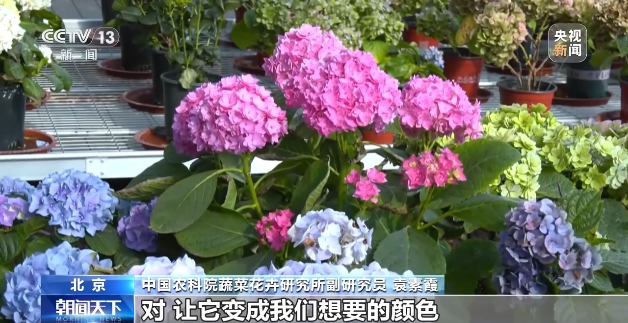繡球被稱為植物中的變色龍,在中國(guó)農(nóng)科院的實(shí)驗(yàn)大棚里,粉色的花朵經(jīng)過(guò)科研人員的調(diào)控后,就會(huì)變成藍(lán)色稀有色,深受消費(fèi)者的喜愛。