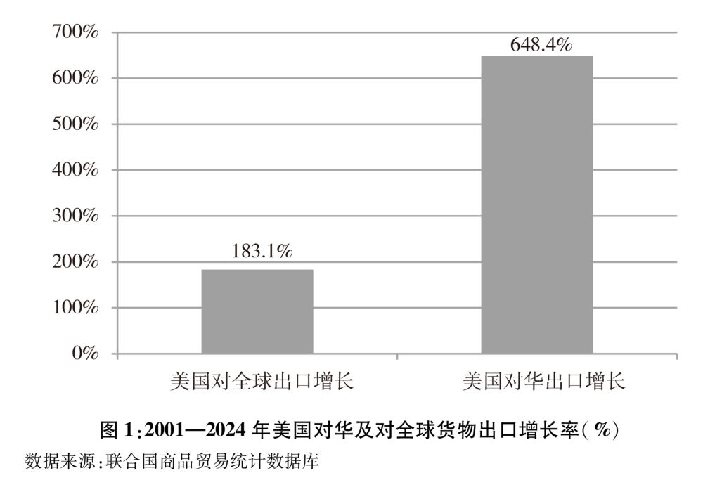 美國對華出口增速明顯快于其對全球出口。中國加入世界貿易組織以來,美國對華出口快速增長,中國成為美國重要的出口市場。根據(jù)聯(lián)合國統(tǒng)計數(shù)據(jù),2024年美國對華貨物出口額1435.5億美元,較2001年的191.8億美元增長648.4%,遠遠高于同期美國對全球183.1%的出口增幅(圖1)。