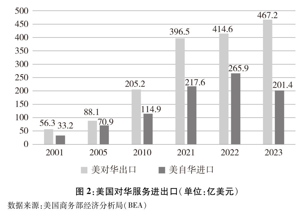 美國服務業(yè)產(chǎn)業(yè)門類齊全,具有較強國際競爭力??傮w來看,隨著經(jīng)濟不斷發(fā)展和人民生活水平提升,中國對服務需求明顯擴大,中美雙方服務貿易快速增長。據(jù)美國商務部統(tǒng)計,2001-2023年,中美服務貿易額由89.5億美元擴大到668.6億美元,增長了6倍(圖2)。根據(jù)中方統(tǒng)計,2023年,美國是中國第二大服務貿易伙伴;據(jù)美方統(tǒng)計,中國是美國第五大服務出口目的地。