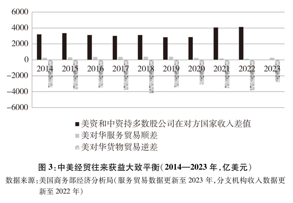 根據(jù)美國商務部數(shù)據(jù),2023年美國對華服務貿易順差為265.7億美元,美國在服務貿易方面占有顯著優(yōu)勢;2022年美資企業(yè)在華銷售額高達4905.2億美元,遠高于中資企業(yè)在美786.4億美元的銷售額,差額高達4118.8億美元,美國企業(yè)跨國經(jīng)營優(yōu)勢更為突出。