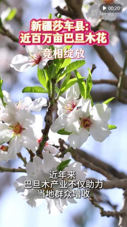 眼下,新疆莎車縣近百萬畝巴旦木花競相綻放,粉白色花朵綿延成畫,芬芳隨風飄蕩。