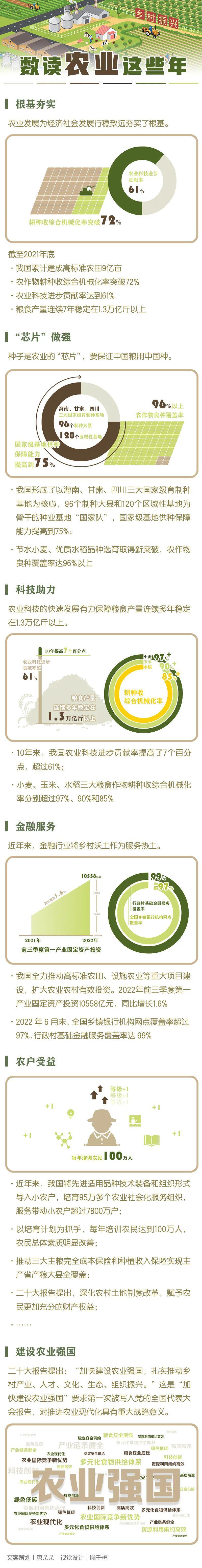 ◆ 截至2021年底,我國(guó)累計(jì)建成高標(biāo)準(zhǔn)農(nóng)田9億畝,農(nóng)作物耕種收綜合機(jī)械化率突破72%,農(nóng)業(yè)科技進(jìn)步貢獻(xiàn)率達(dá)到61%,糧食產(chǎn)量連續(xù)7年穩(wěn)定在1.3萬億斤以上,為經(jīng)濟(jì)社會(huì)發(fā)展行穩(wěn)致遠(yuǎn)夯實(shí)了根基。